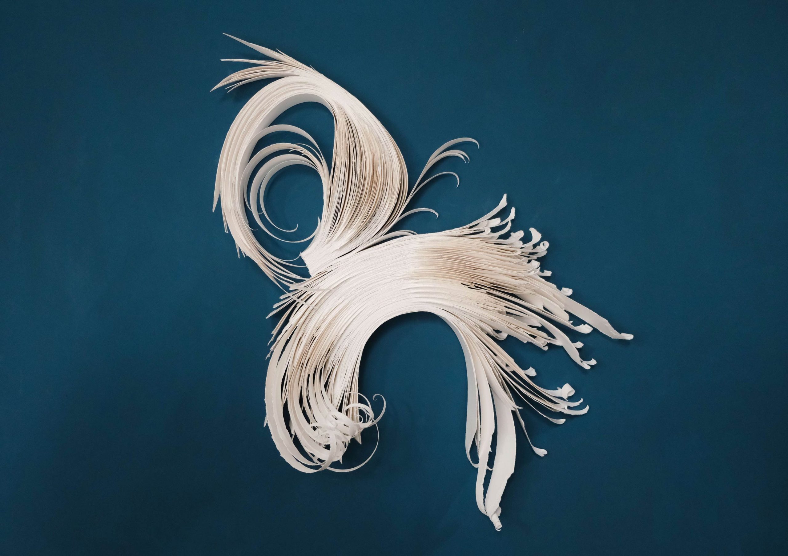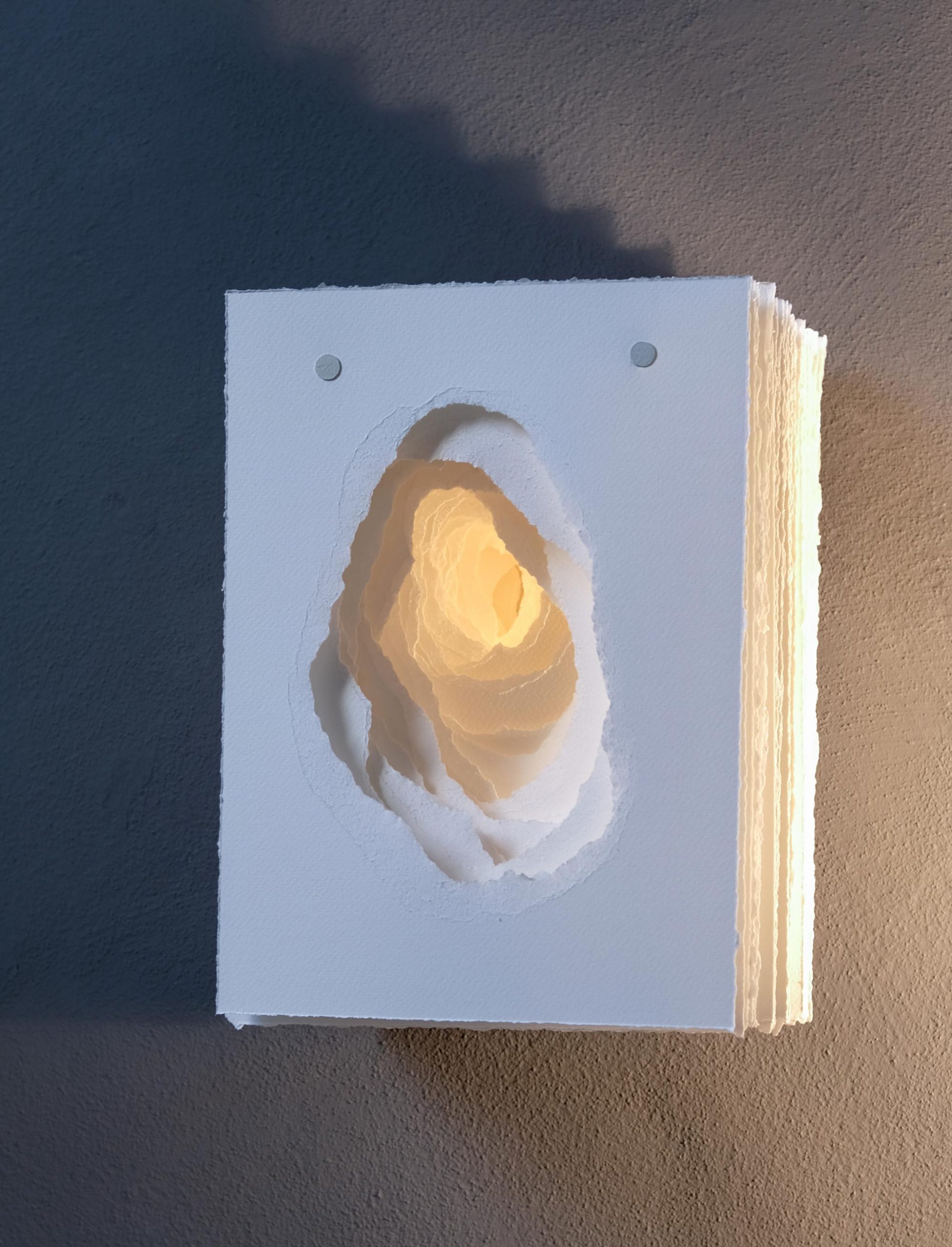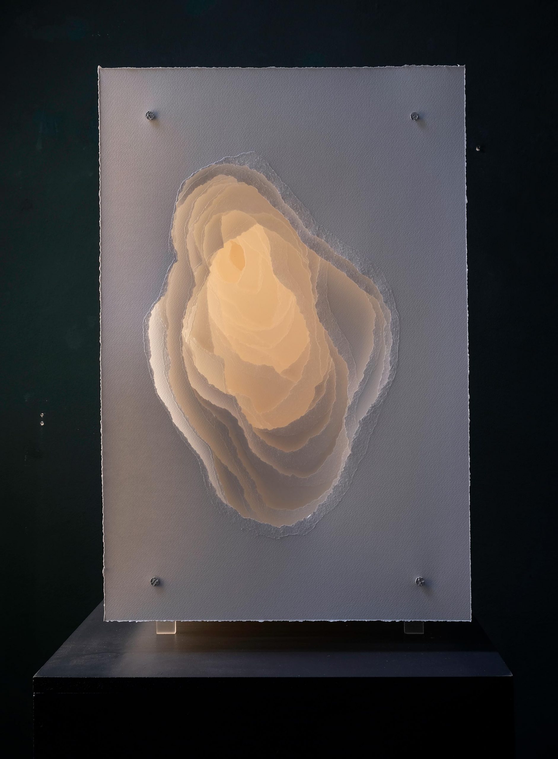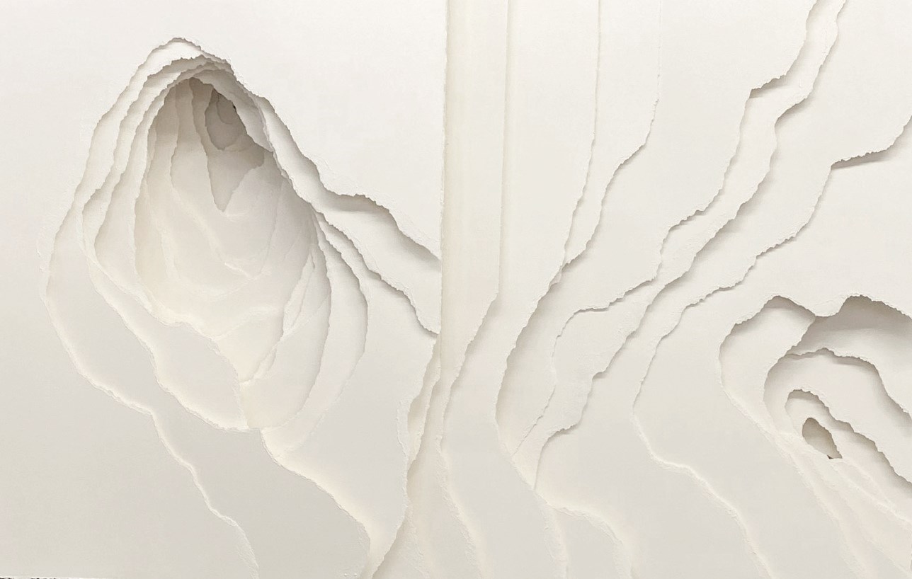 2022-008 Terforation, Papier 200 g, gerissen, Halterung aus Metall und Kunststoff, 66 x 43 x 40 cm