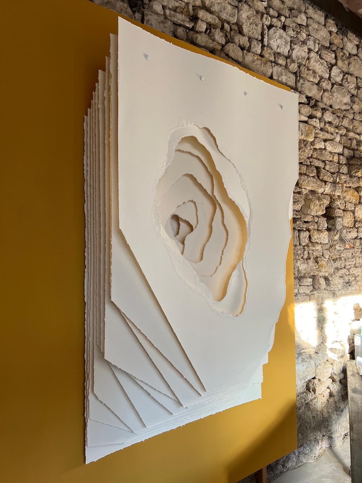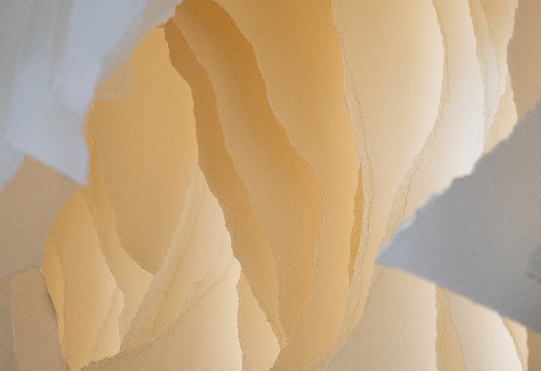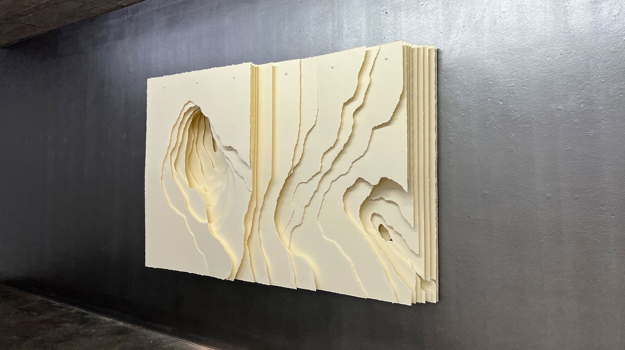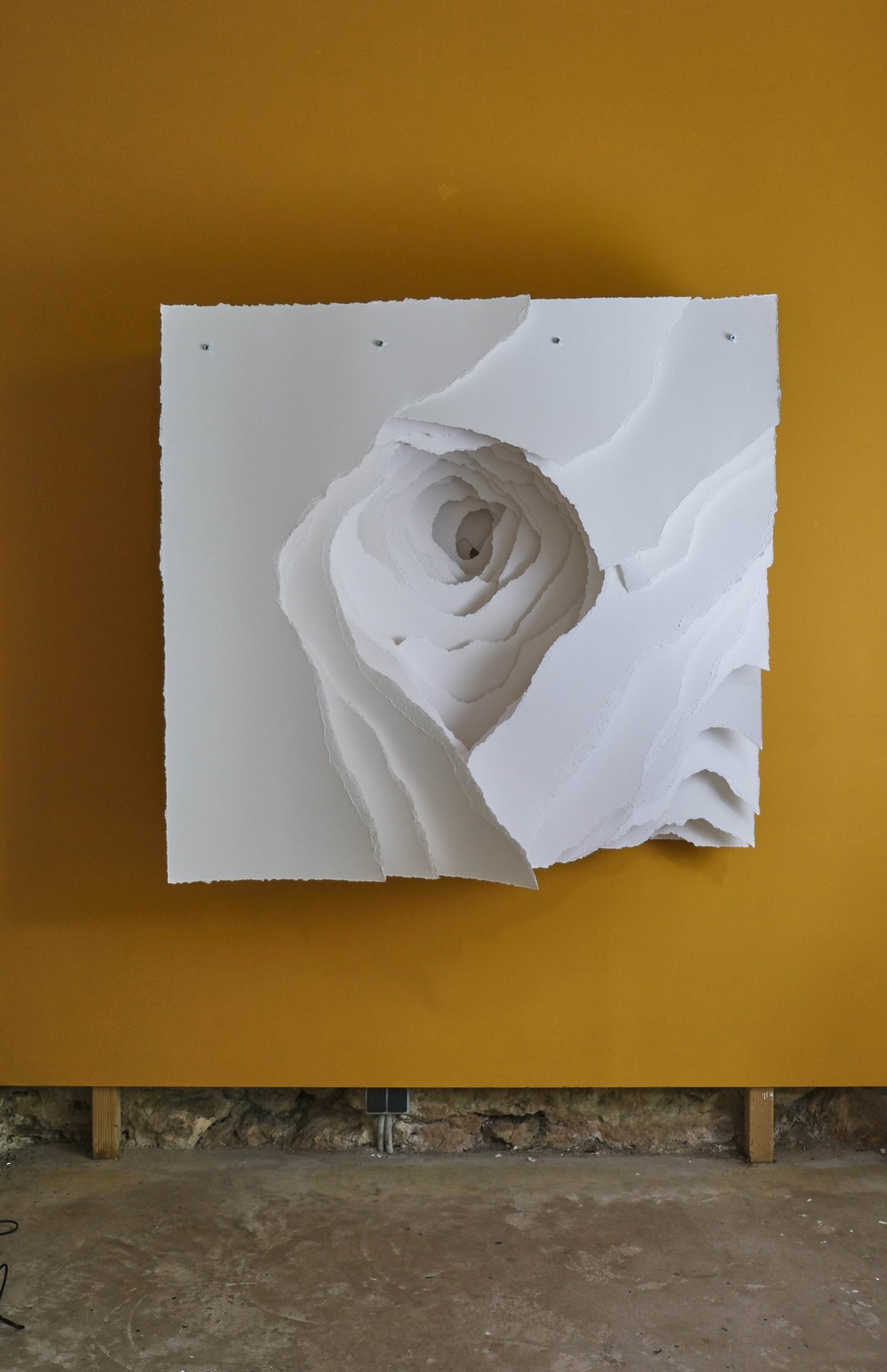 2024-033 Terforation, Papier 400 g, gerissen, Halterung aus Metall und Kunststoff, 137 x 146 x 62 cm