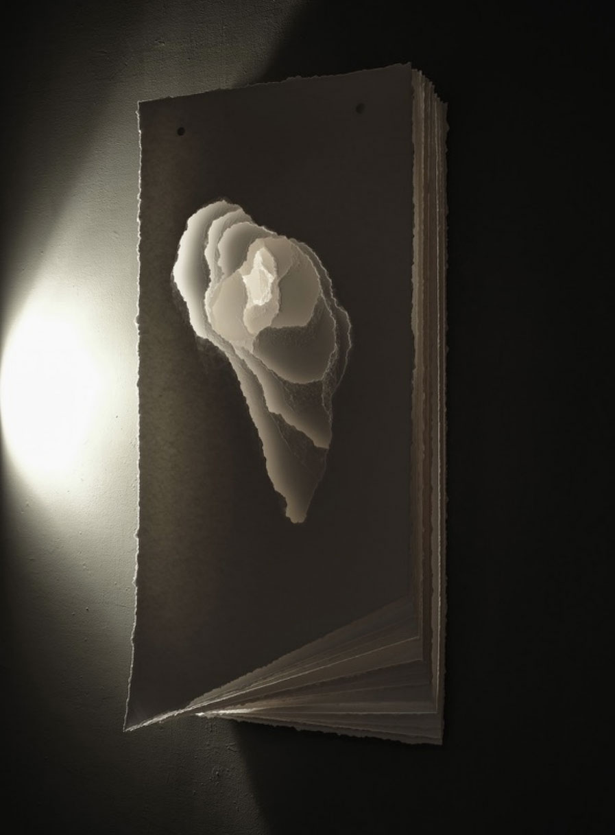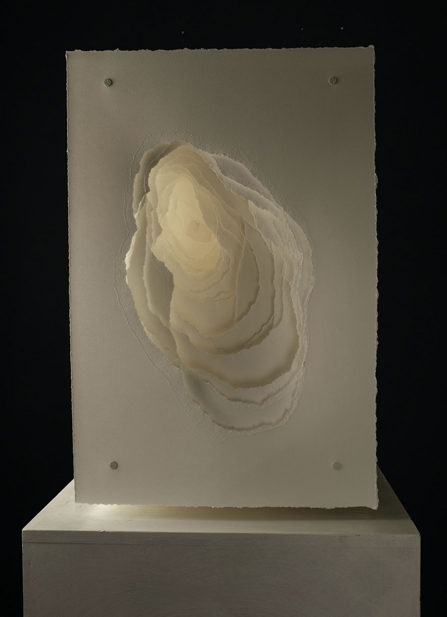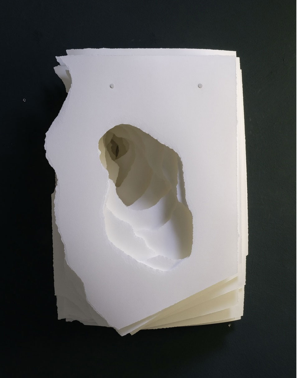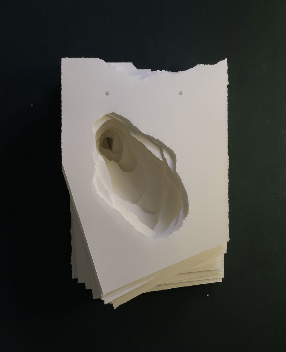 2022-013 Terforation, Papier 200g, gerissen, Halterung aus Metall und Kunststoff, 74 x 51 x 22 cm