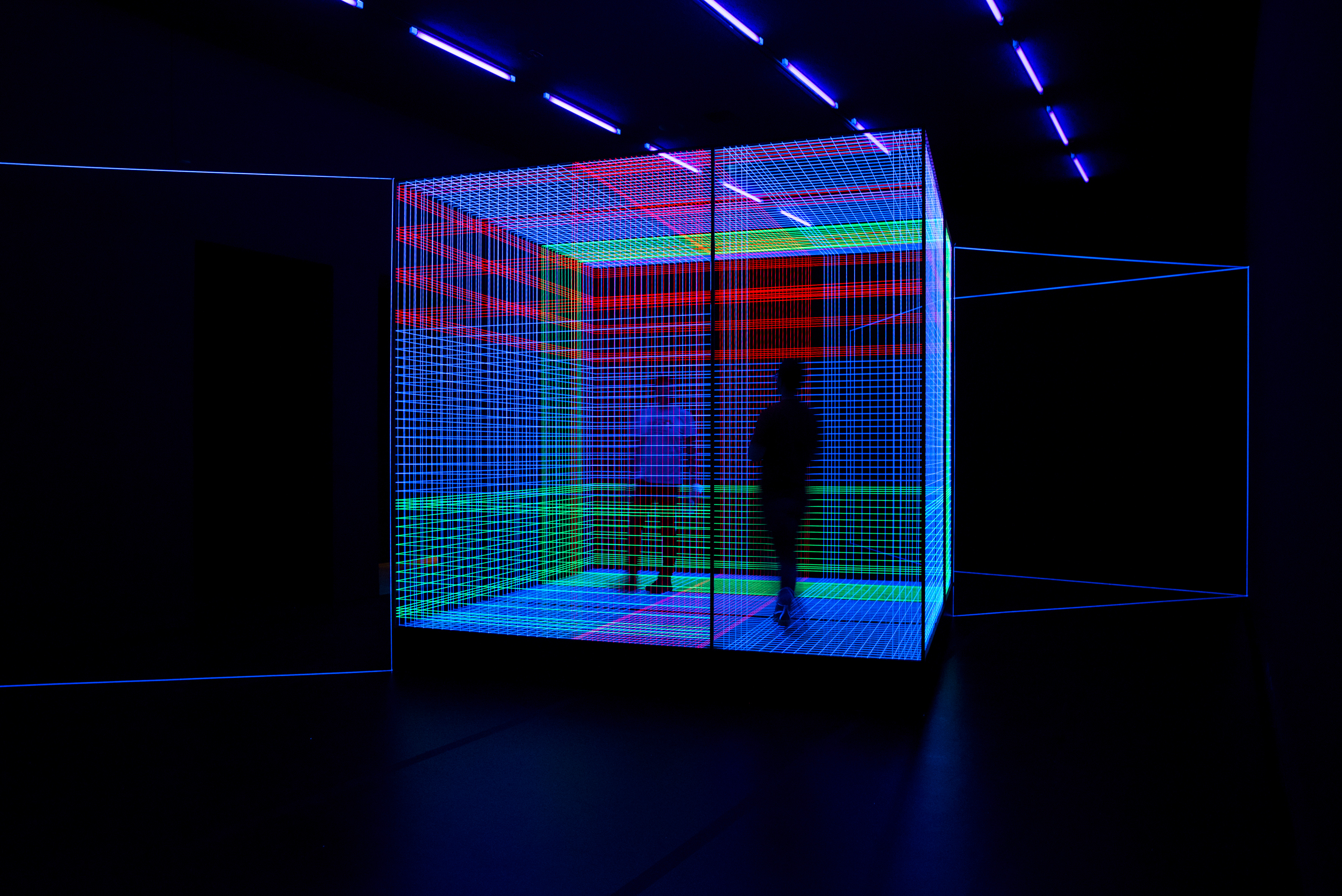 Birdcage, Rauminstallation, Fäden/Schwarzlicht