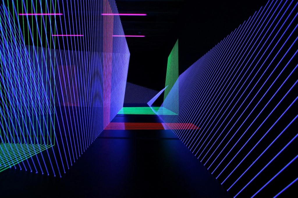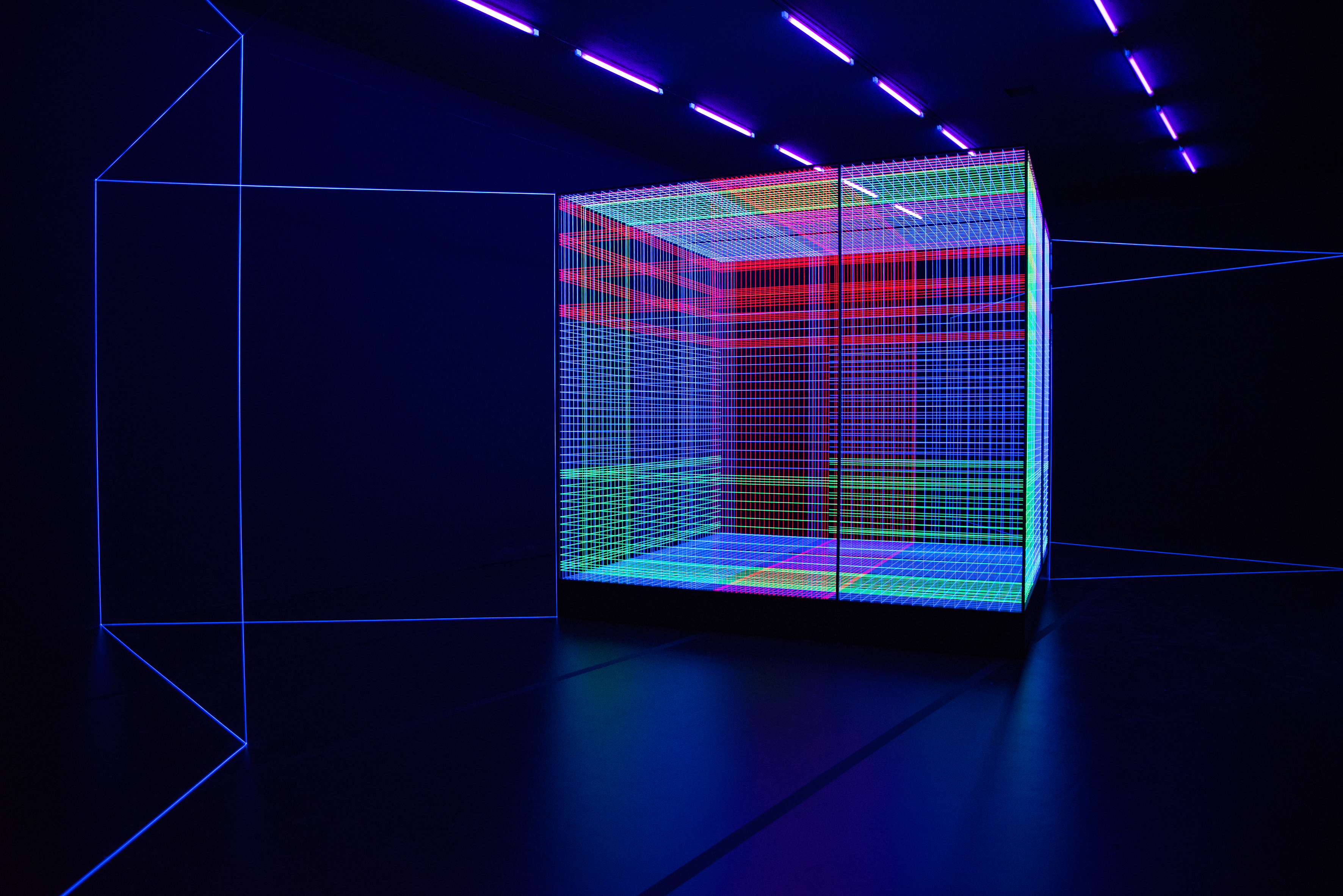 Birdcage_Illusion, 2018, Rauminstallation, Fäden/UV-Licht, 897 x 362 cm