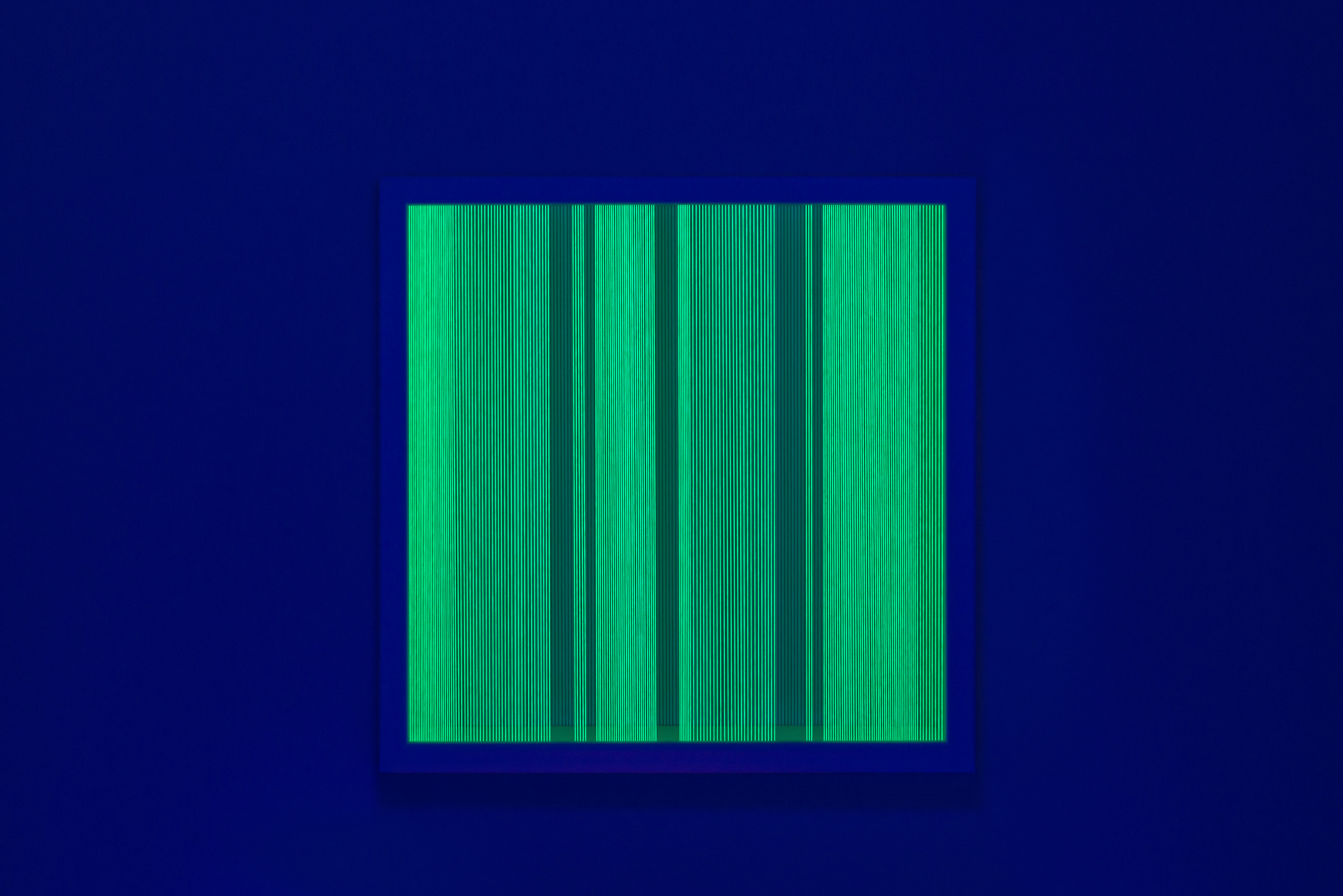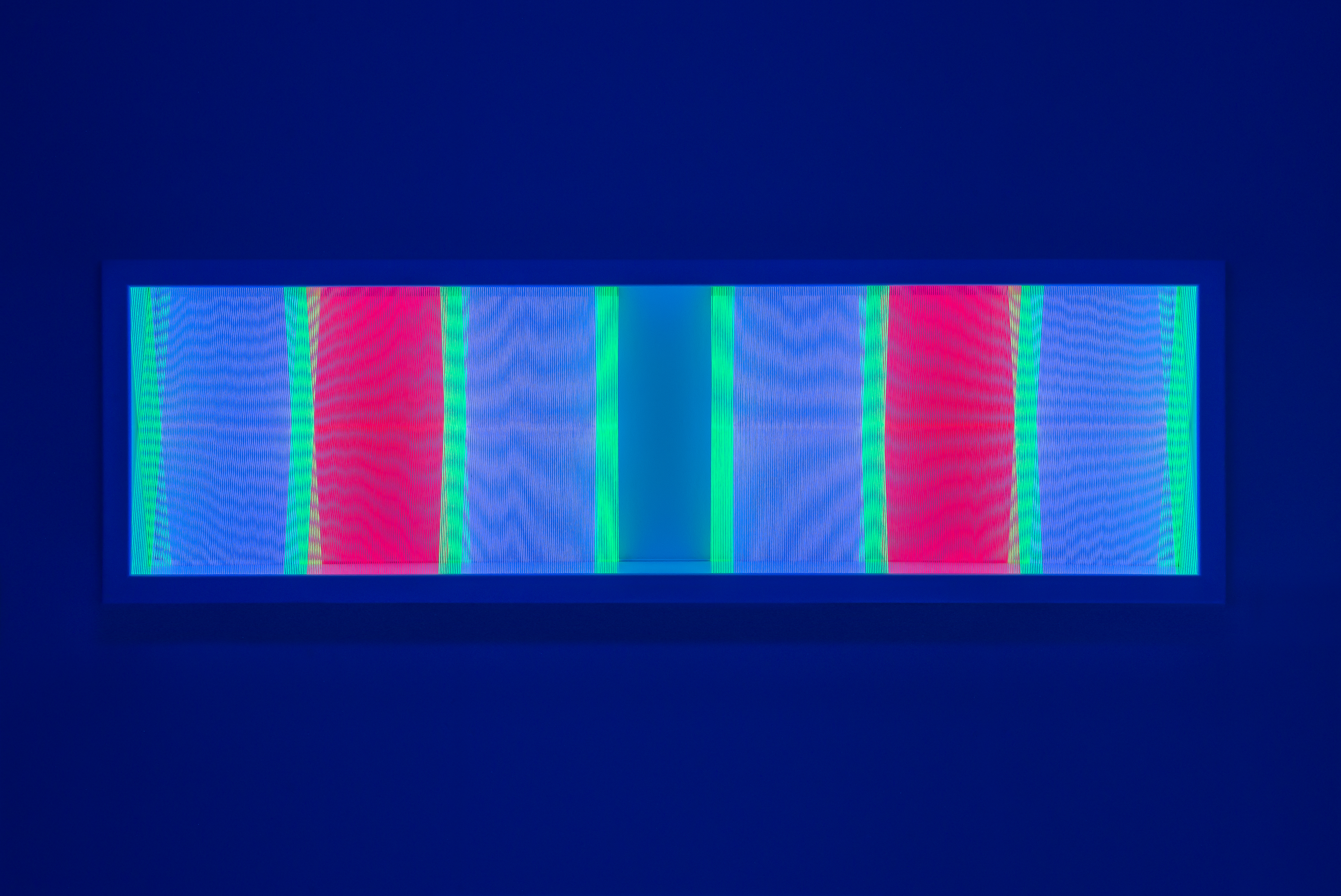 Illusion_ym2 (unter UV-Licht), 2018, Fäden, Holzrahmen, 100 x 30 cm