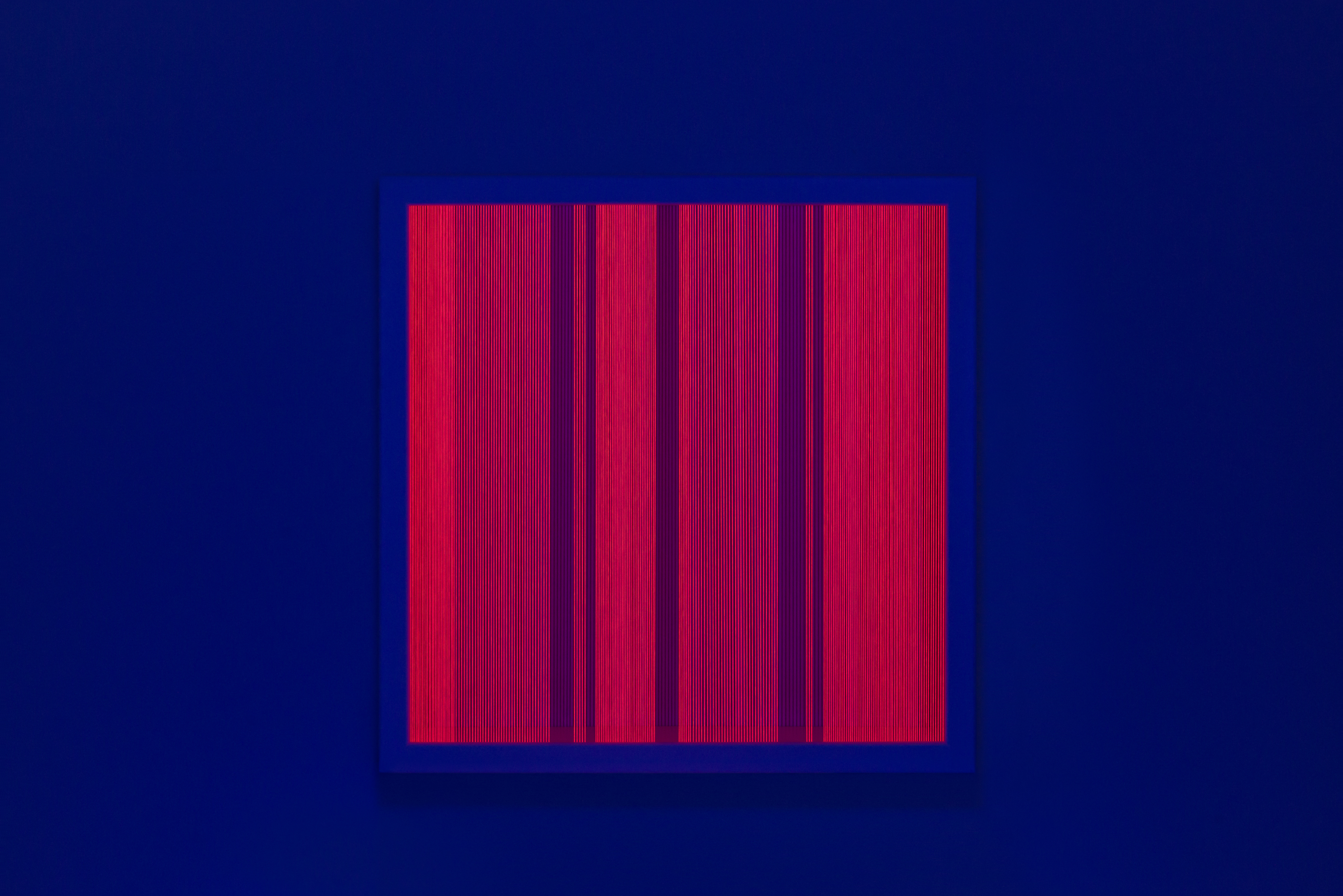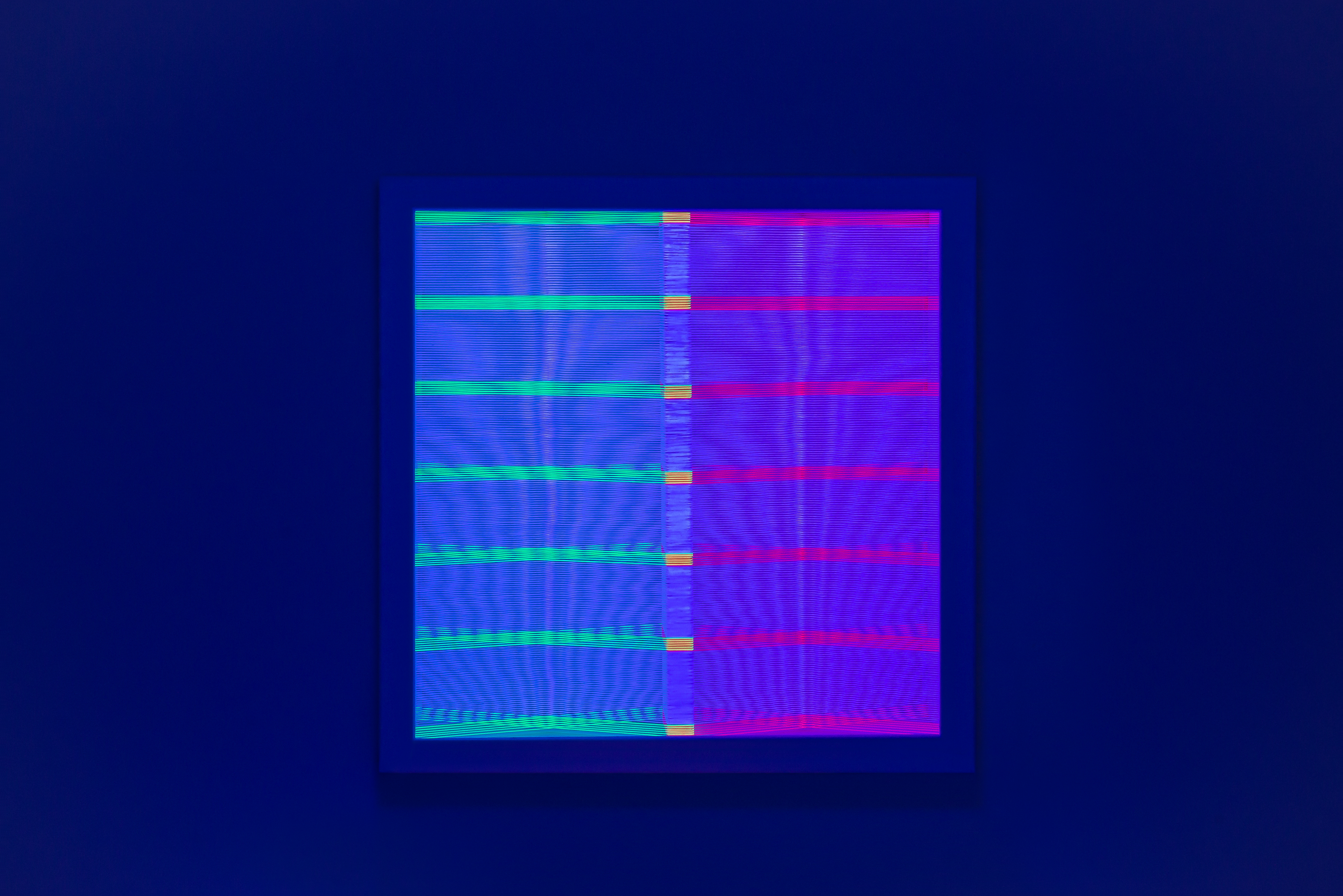 Illusion_m2 (unter UV-Licht), 2018 Fäden, Holzrahmen, 50 x 50 cm