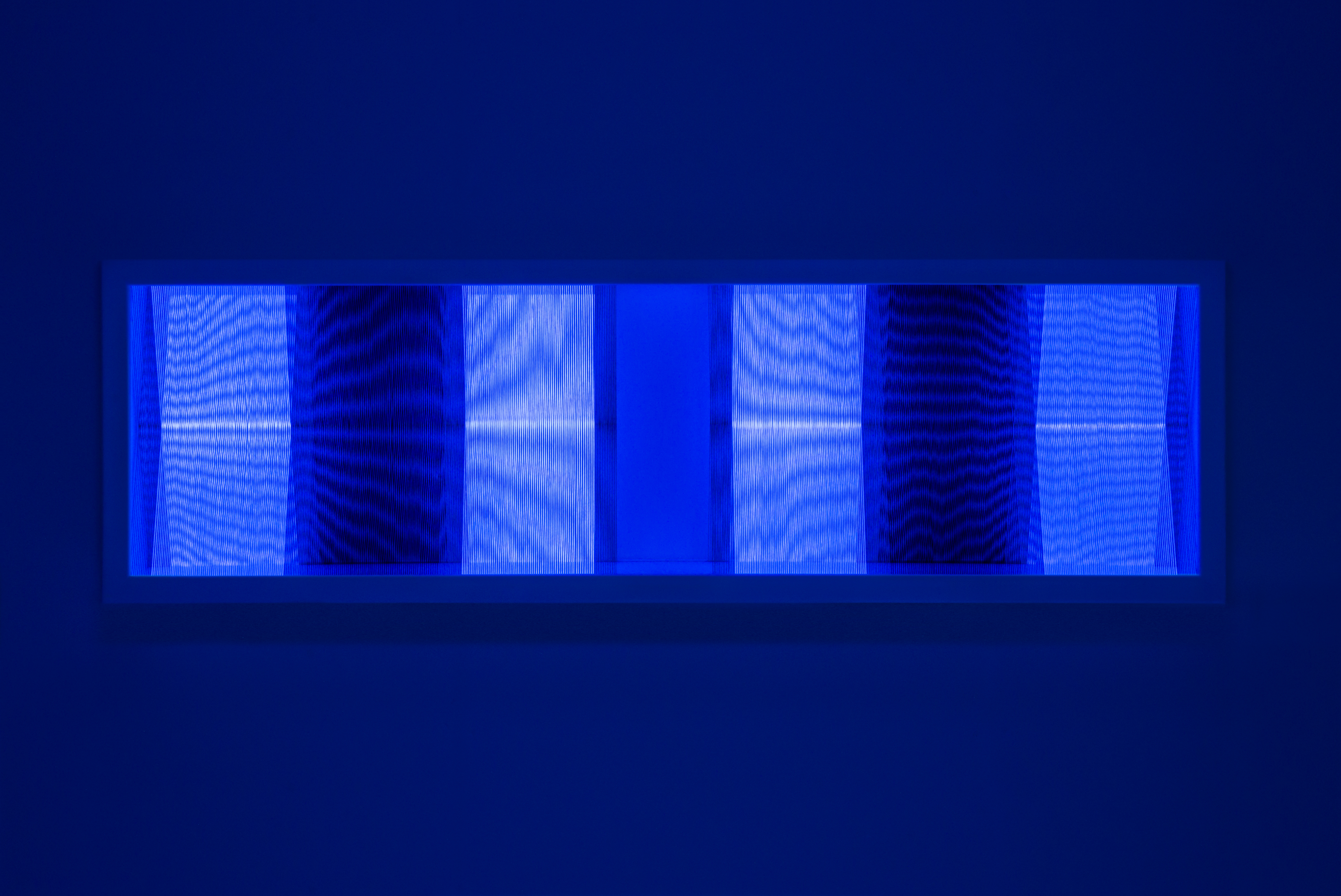 Illusion_bw1 (unter UV-Licht), 2018 Fäden, Holzrahmen 100 x 30 cm