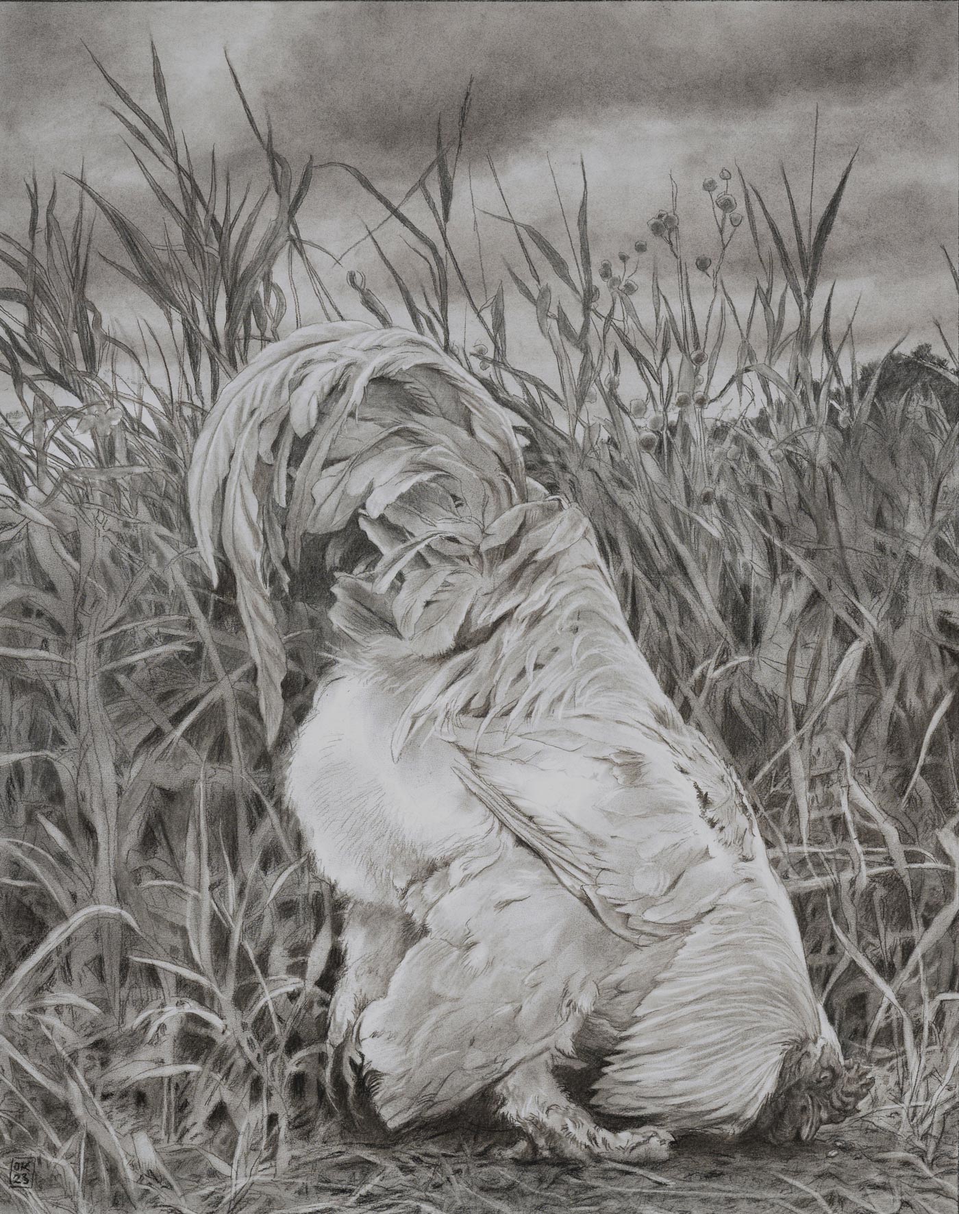 Hahn, 2023, Kohle auf Papier, 70 x 88 cm