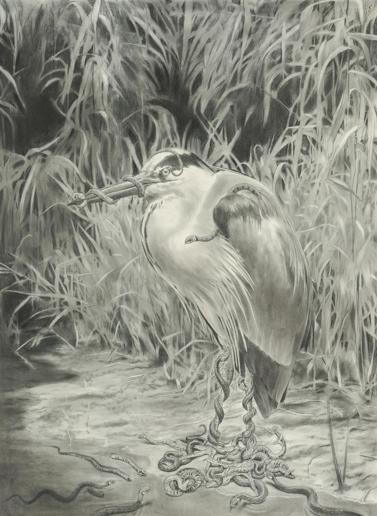 Reiher und Schlangen, 145 x 106 cm, Kohle auf Papier