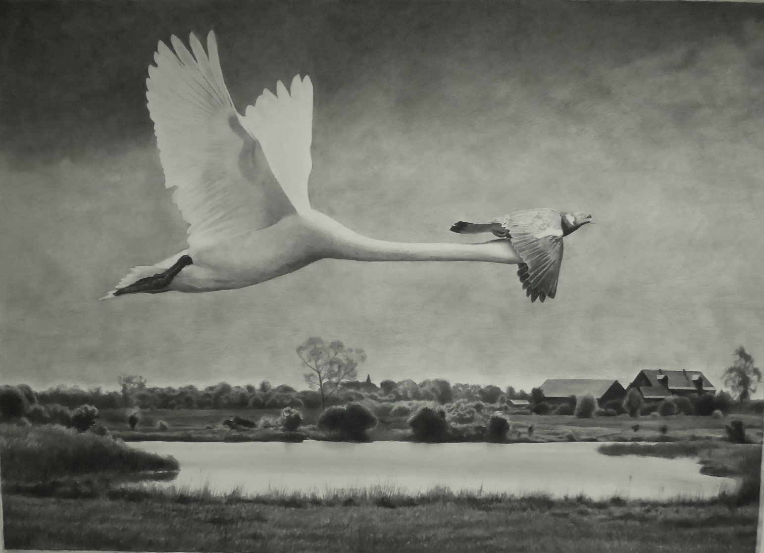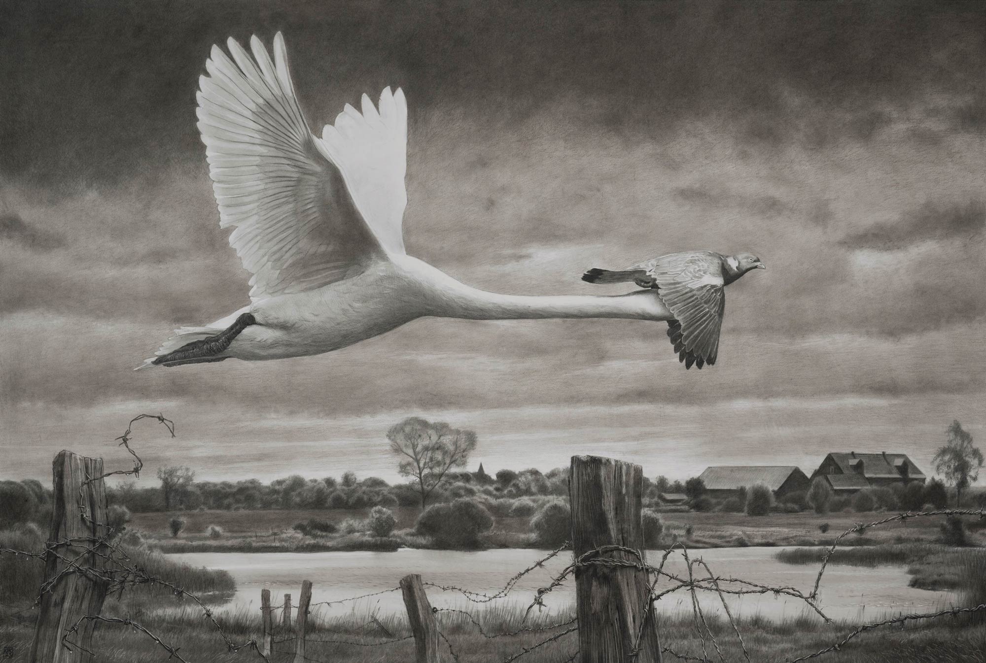 Schwan und Taube, 160 x 230 cm, Kohle auf Papier
