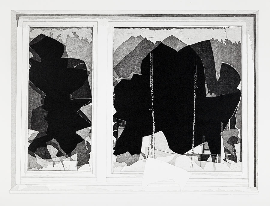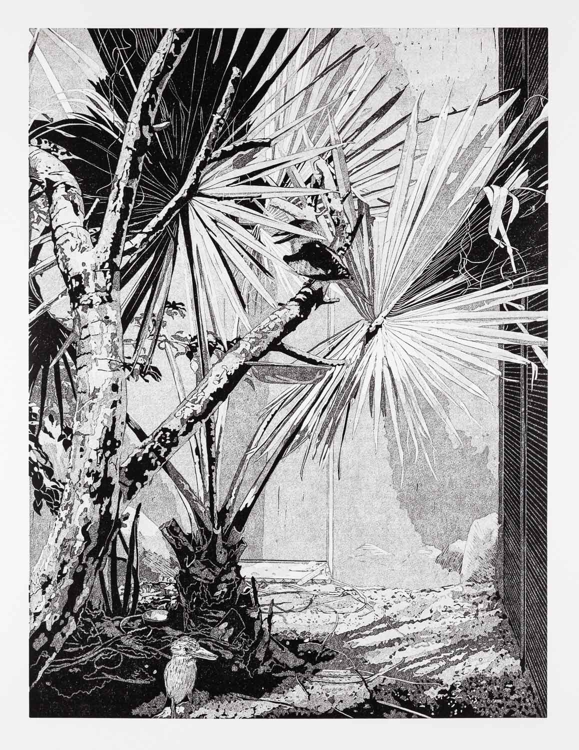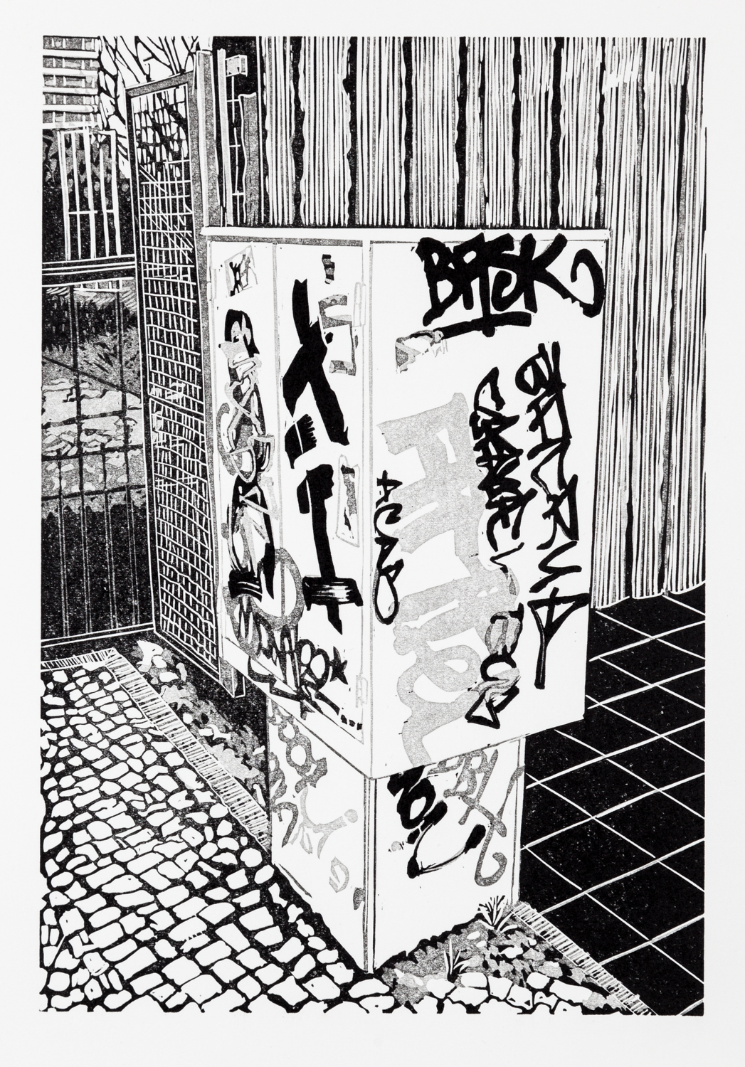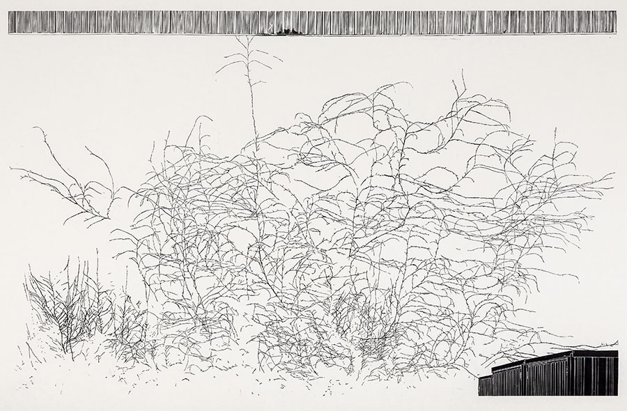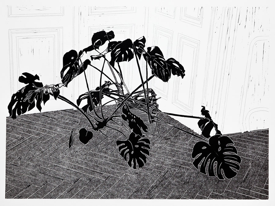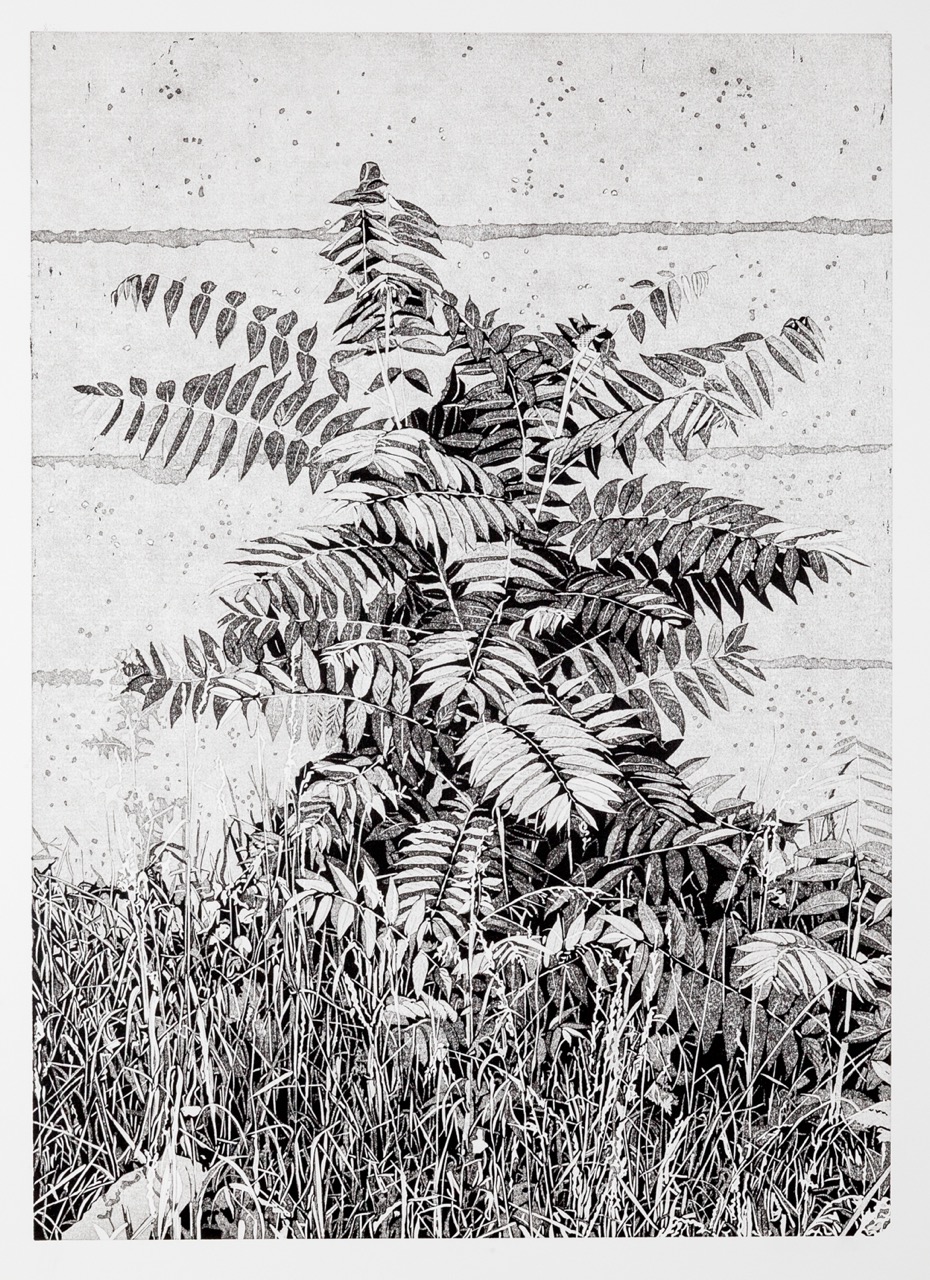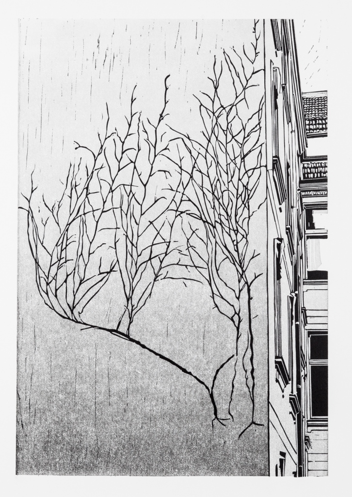 Aussicht, 2018, Linolschnitt, 2 Farben, Reduktion, Auflage 20, Druck: 29,2 x 20,2 cm, Papier: 39 x 29 cm, Teil des Mappenwerkes „3 x 2“ mit weiteren Arbeiten von Sebastian Speckmann und Claas Gutsche