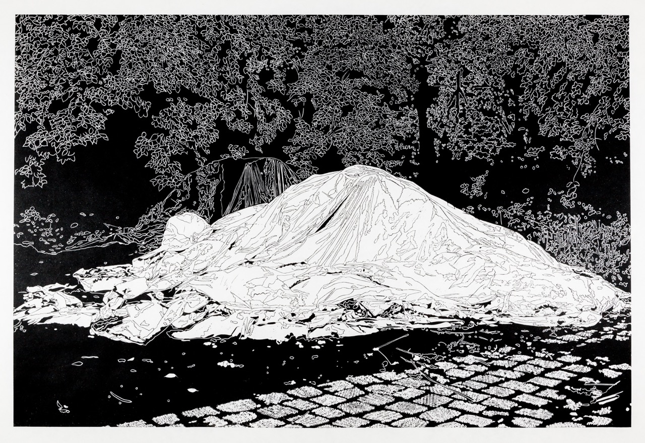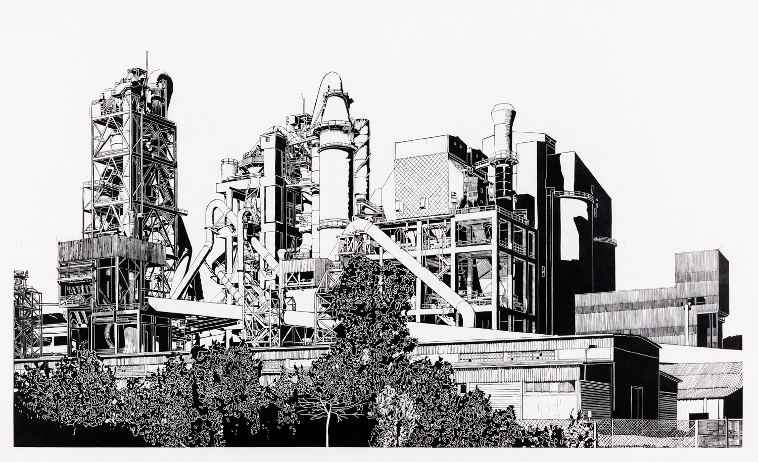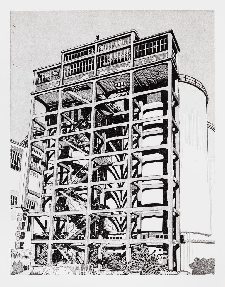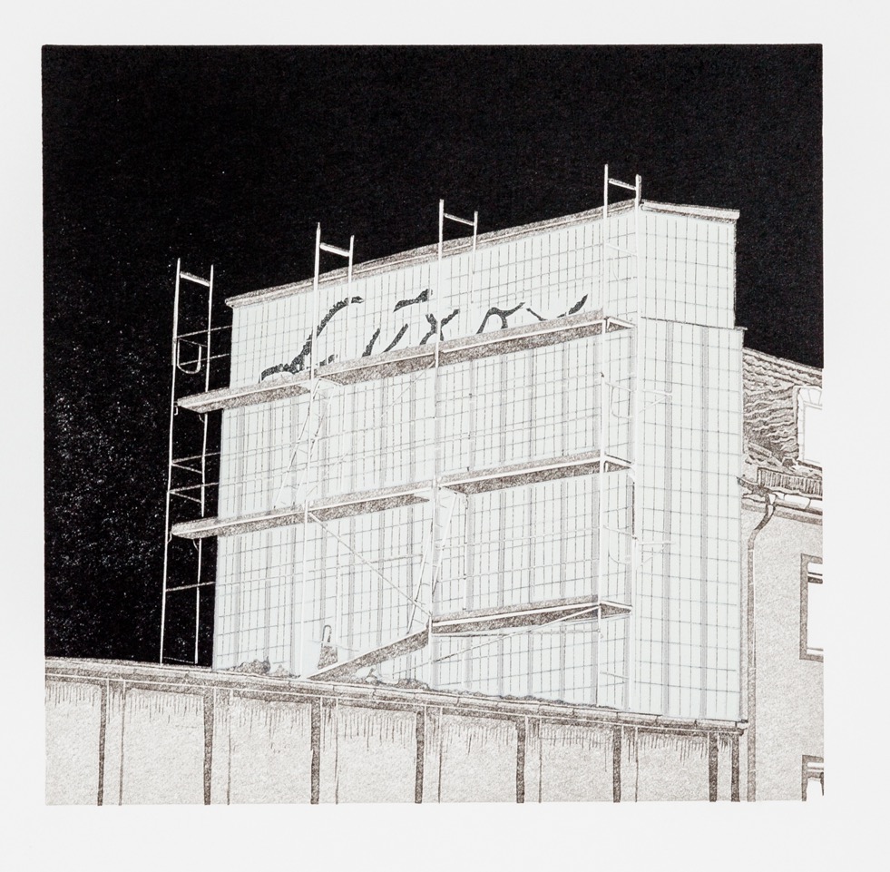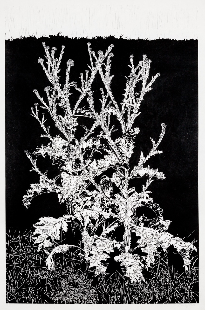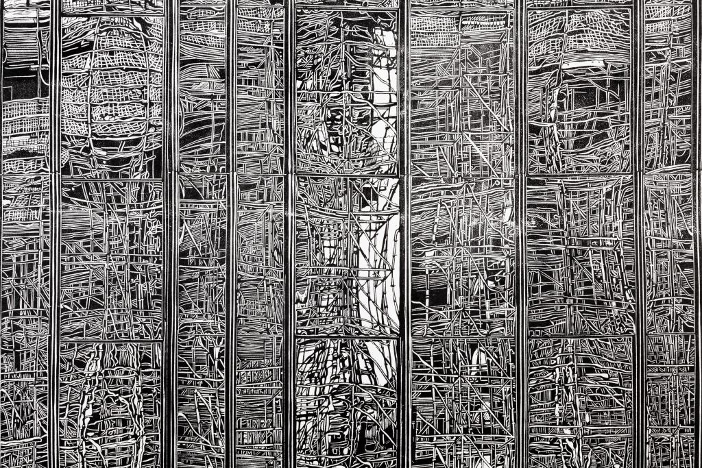 Aussicht, 2018, Linolschnitt, 2 Farben, Reduktion, Auflage 20, Druck: 29,2 x 20,2 cm, Papier: 39 x 29 cm, Teil des Mappenwerkes „3 x 2“ mit weiteren Arbeiten von Sebastian Speckmann und Claas Gutsche